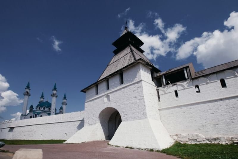 Казанский Кремль. История Казани начинается с древнейших укреплений булгарского поселения, сооружённых на рубеже Х-ХI веков. В домонгольский период город развивался как военно-торговое место. Уже в XII веке Казанский кремль становится каменным форпостом на северной границе Волжской Булгарии. В ХIII-XV веках крепость превращается в центр Казанского княжества в составе Золотой Орды. С 1438 по 1552 год кремль - военный и административный центр Казанского ханства. После взятия в 1552 году войсками Ивана Грозного бывшая столица Казанского ханства становится административным и военным центром присоединённого Поволжья (1552-1708). С 1708 года Казанский кремль - центр Казанской губернии. После взятия Казани Грозным крепость лежала в руинах. Строительство нового кремля царь поручил псковским зодчим Постнику Яковлеву и Ивану Ширяю (строителям собора Василия Блаженного). Крепость была значительно расширена, шесть башен (из 13) построили из камня, но лишь треть деревянной стены общей протяжённостью 1800 метров удалось заменить каменной, а большую часть стены вновь возвели из дуба. Только в начале XVII века кремль полностью стал каменным. Одновременно с возведением стен псковские мастера построили и первые православные храмы Казанского кремля: Благовещенский собор (XVI век), церковь Киприана и Иустины, церковь Дмитрия Солунского у Дмитриевской башни, Спасскую церковь, а также два монастыря - Троице-Сергиевский и Спасо-Преображенский (XVI век). Более полутора века в Казанском кремле сохранялось пять каменных зданий ханского времени: ханская мечеть, ханский дворец и мавзолеи, используемые в качестве складских помещений для хранения оружия и боеприпасов, но со временем за ветхостью они были разобраны. Многоминаретная мечеть Кул-Шариф (названа в честь последнего имама сеида Кул-Шарифа, одного из предводителей обороны Казани), центр религиозного просвещения и развития наук Среднего Поволжья XVI столетия. Была разрушена в октябре 1552 года во время штурма Казани войсками Ивана Грозного. Воссоздана в первоначальном облике в 1996 году. Является главной джума-мечетью Республики Татарстан и Казани. Башня Сююмбике. Учёные предполагают, что она была построена в период правления хана Шах-Али, установившего добрые отношения с Москвой. Высказываются гипотезы, что московский князь мог прислать для её постройки своих мастеров, чем и объясняется внешнее сходство Сююмбике с Боровицкой башней Московского Кремля. До 1917 года Сююмбике была увенчана двуглавым орлом. После революции над ней вознёсся полумесяц, который в 1930-х убрали, а в 1990-х вновь водрузили на место. С 2000 года Казанский кремль включён в Список всемирного культурного и природного наследия ЮНЕСКО.