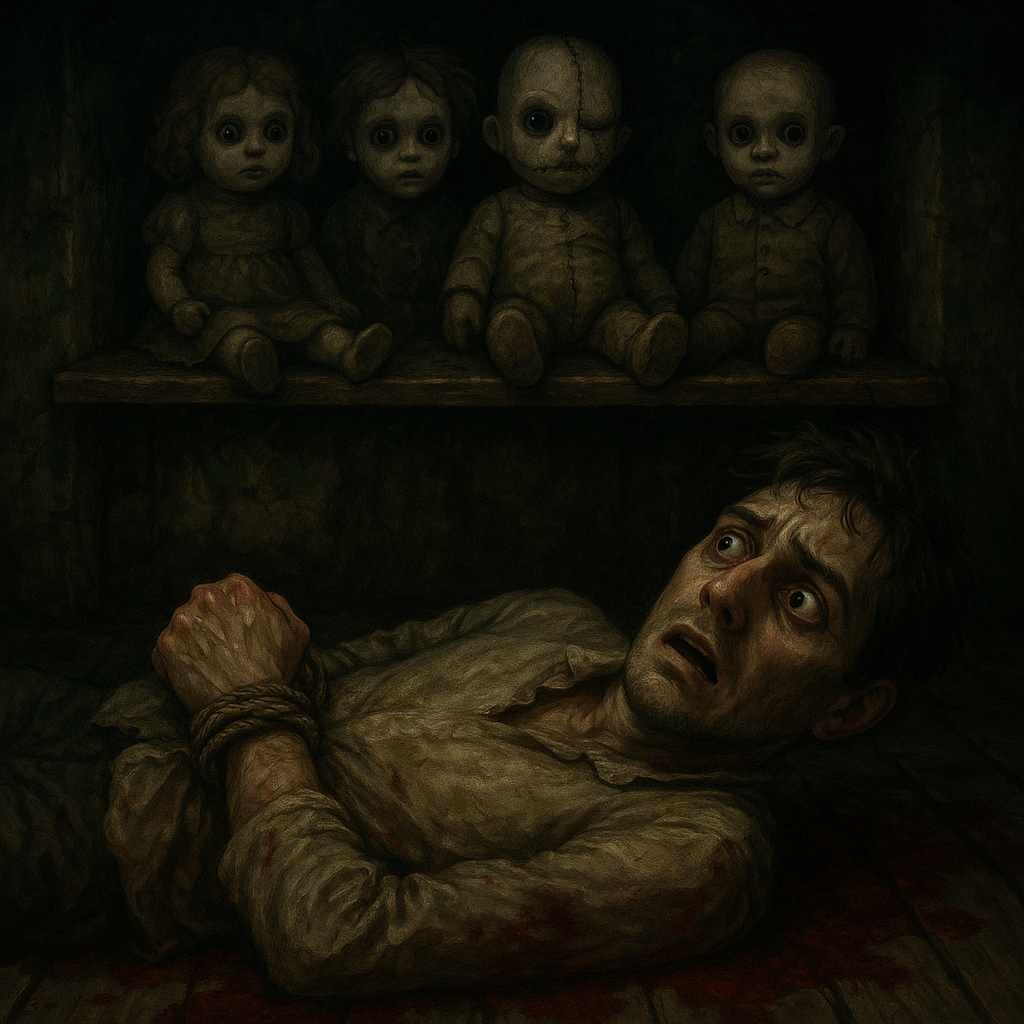 Потом я очнулся в маленькой коморке, лежащим на полу. Мои руки и ноги были связаны прочной веревкой. Во рту ощущался мерзкий железистый привкус. Сильно болела голова. Коморка была слабо освещена, но этого света было достаточно, чтобы хорошо всё осмотреть. Кирпичные, покрытые плесенью, стены; высокий потолок в центре которого виднелось квадратное очертание, напоминающее крышку без ручки. Отчего то земляной пол оказался застелен досками. Всюду царила грязь, темно-бурые кровавые разводы и мелкие кости, неизвестного мне происхождения. На одной стене красовалась полка, на которой плотным рядком сидели маленькие тряпичные куклы. От них исходил неприятный, сладковато-кислый запах. Эти до жути пугающие игрушки, разительным образом отличались друг от друга. Каждое лицо сохраняло индивидуальные черты, мимику. При этом только на нескольких куклах была одежда. Драные тряпицы, изображающие платья.
