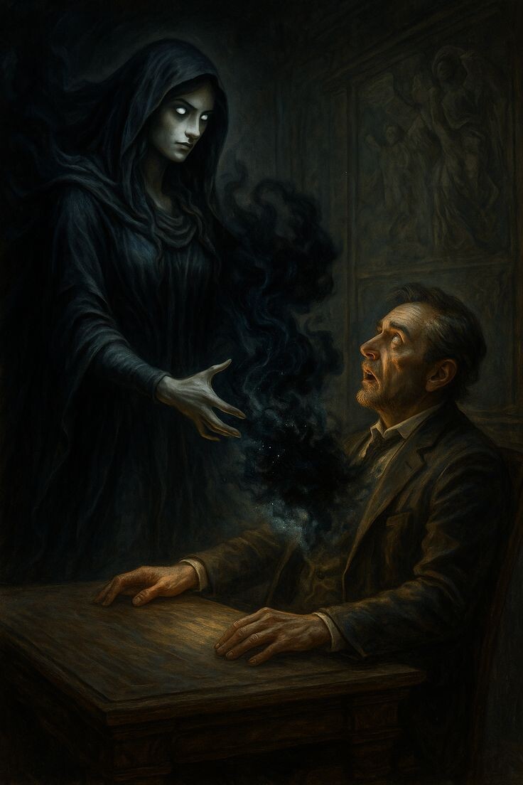 Фигура на кровати медленно повернула к нему голову. Это был он сам — точная копия, только с глазами черными, как смола, и ртом, растянутым в неестественной ухмылке.