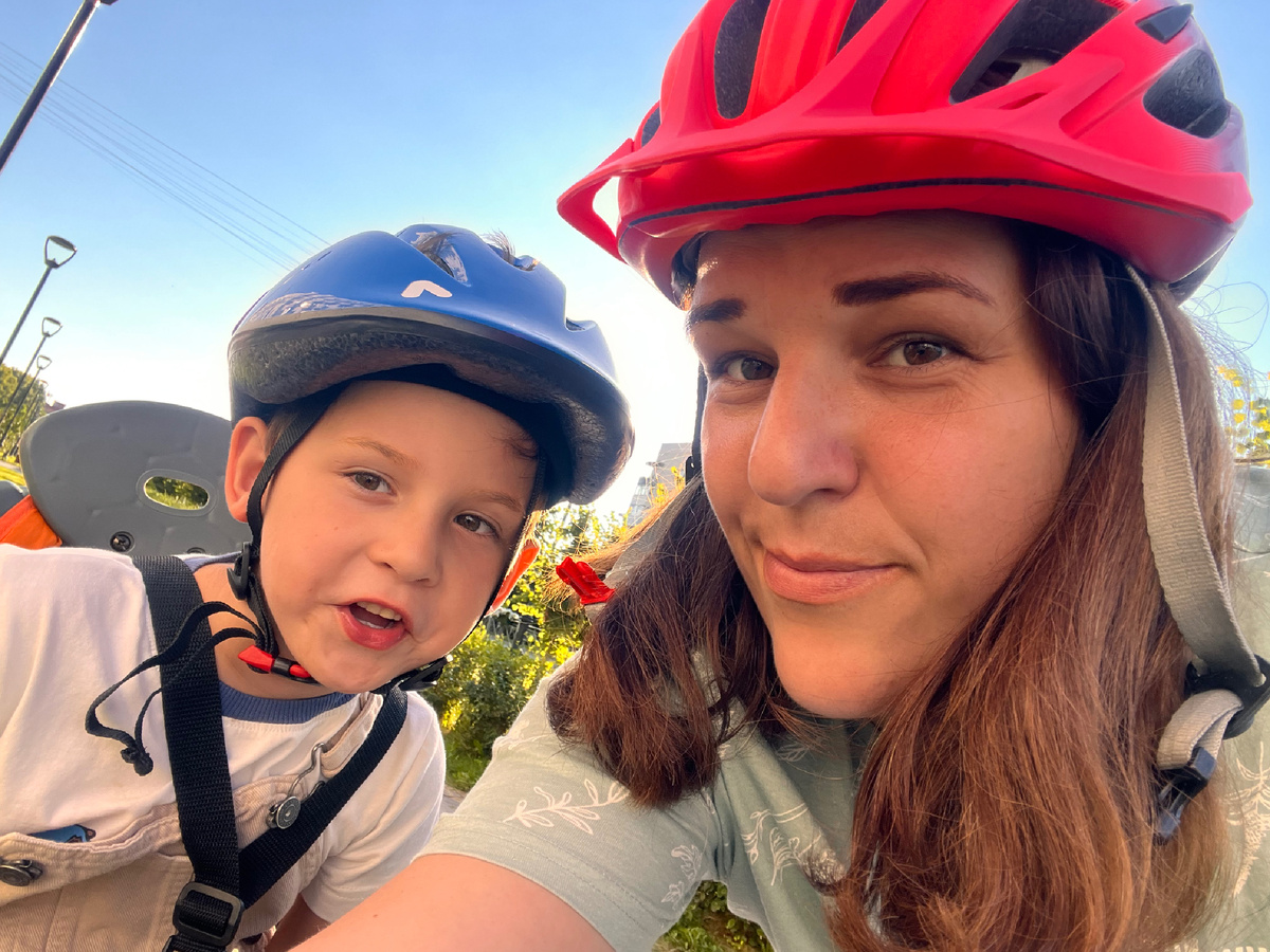 Записки Евгении... На что я вообще рассчитывала? Жара немного спала, появилась возможность хотя бы вечерами проводить активно время. Попросила отца привести нам из деревни велосипеды, ведь там в этом году трава такая высокая, что кататься по полю возможности нет. Так и простояли наши велосипеды все лето в сарае. Соскучились мы по этому делу и в первый же вечер собрались своей веселой компанией исследовать дороги нашего парка. Там, где это еще разрешено. На одном велосипеде я, сзади меня Мирон в кресле (хорошо, что еще помещается), а спереди Шаня (для нее купила специальную корзинку). На кресло Мирона еще и рюкзак повесили с водой и небольшим запасом перекусов. Тяжелый у меня получился велосипед, его даже просто катить-то было непросто. Хорошо хоть Марат уже спокойно катается на своем велосипеде. И Шаню я в парке отпускаю побегать. Она этого момента ждет с нетерпением! На всех шлемы, безопасность превыше всего. :) Особенно за детей переживаю, а они уж тоже следят, чтобы я от них не