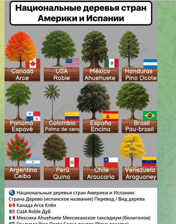 🌎 Национальные деревья стран Америки и Испании: Страна Дерево (испанское название) Перевод / Вид дерева 🇨🇦 Канада Arce Клён 🇺🇸 США Roble Дуб 🇲🇽 Мексика Ahuehuete Мексиканское таксодиум (болиголов) 🇭🇳 Гондурас Pino Ocote Сосна окуоте (Pinus oocarpa) 🇵🇦 Панама Espavé Анакардиум превосходный 🇨🇴 Колумбия Palma de cera Восковая пальма 🇪🇸 Испания Encina Вечнозелёный дуб (Quercus ilex) 🇧🇷 Бразилия Pau-brasil Бразильское дерево (Paubrasilia echinata) 🇦🇷* Аргентина Ceiba Цеиба (Erythrina crista-galli) 🇵🇪 Перу Quina Хинное дерево (Cinchona officinalis) 🇨🇱 Чили Araucaria Араукария чилийская 🇻🇪 Araguaney Арагуней (Handroanthus chrysanthus) *🌳🇦🇷 Национальным деревом Аргентины считается ceibo (це́йба, лат. Erythrina crista-galli), яркое дерево с красными цветами, символизирующее силу, страсть и латиноамериканскую идентичность. Оно растёт вдоль рек и болот на северо-востоке страны, особенно в провинциях Энтре-Риос и Санта-Фе.