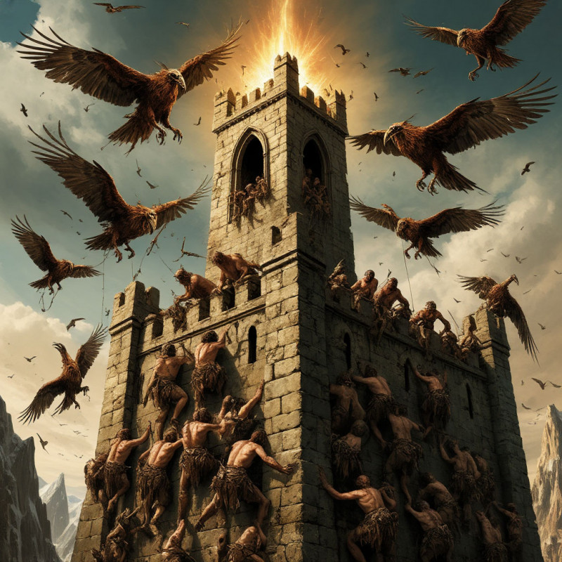 Ну конечно же, лезли по очереди, дождавшись прозвучавшей сирены и появления бегущих к башне и начинающих на нее лезть голых волосатых дикарях. И ведь ни одной девушки – никакого эстетического удовольствия.