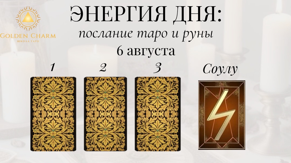 Заказать личный расклад тут✅ Прогноз на 6 августа : что тебя ждёт Приходи на обучение Таро ✅ Выбери карту — 1, 2 или 3 — и узнай, какой путь для тебя: 1. Туз Кубков Это день любви, радости и вдохновения. Новые чувства наполнят твоё сердце радостью и гармонией. Ты почувствуешь глубокую связь с миром и людьми вокруг тебя. Позволь себе испытать всю полноту жизни. 2. Три Кубков Время праздновать успехи и делиться радостями с близкими. Возможно, произойдут события, достойные празднования. Наслаждайся моментом, общением и теплом дружеских объятий. 3. Шесть Жезлов Победа близка, твои усилия будут вознаграждены признанием и уважением окружающих. Настройся на успех и уверенно двигайся вперёд, ведь впереди тебя ждут триумф и признание. Руна дня — Соулу Энергия солнца, света и процветания наполняет этот день. Это время новых возможностей, роста и развития. Будь открыт новым идеям и возможностям, они приведут тебя к большим достижениям. Напиши цифру карты + СОУЛУ в комментариях