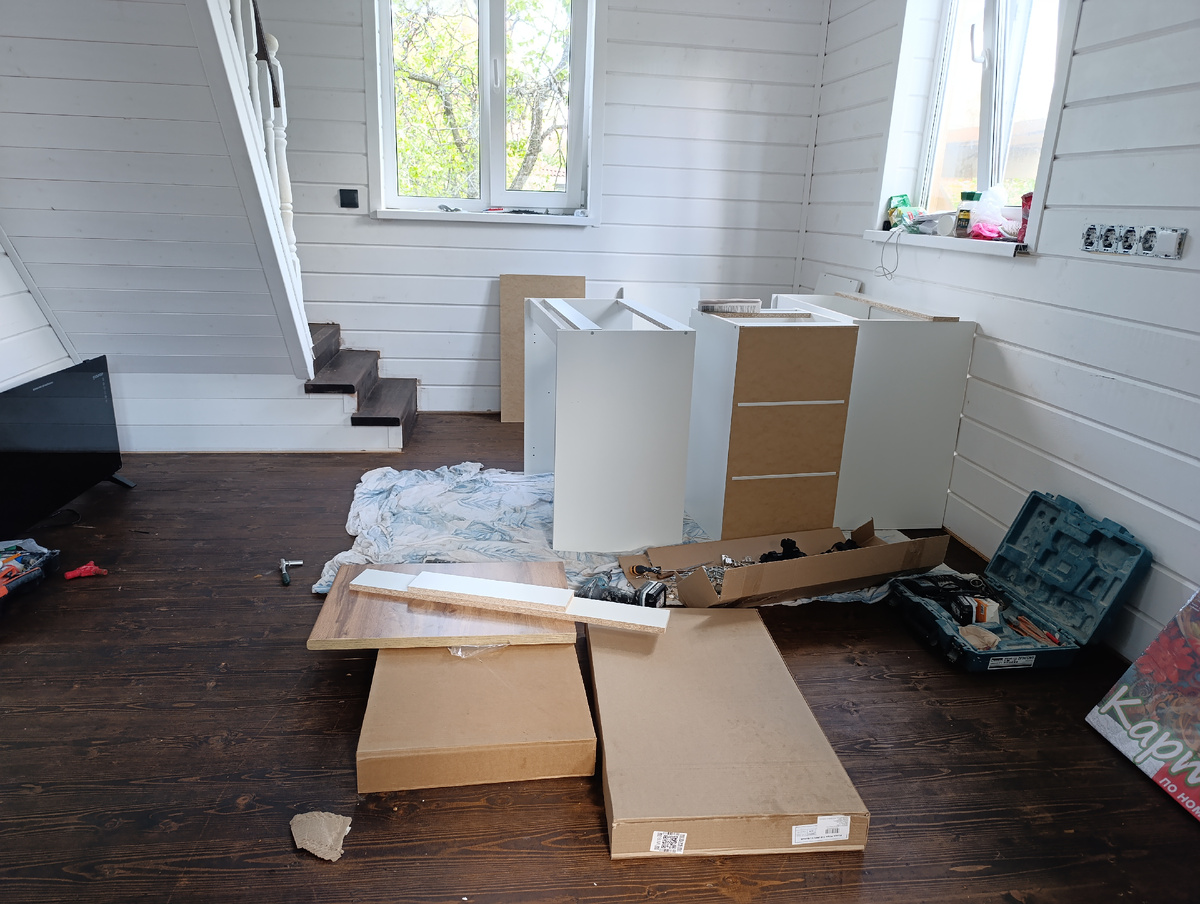 Нет, ничего ещё не закреплено и расположение шкафов неоконательное, но уже вид у кухни-гостиной другой. А главное, что разгрузили обеденный стол, нет больше таких завалов и соответственно бардака:
