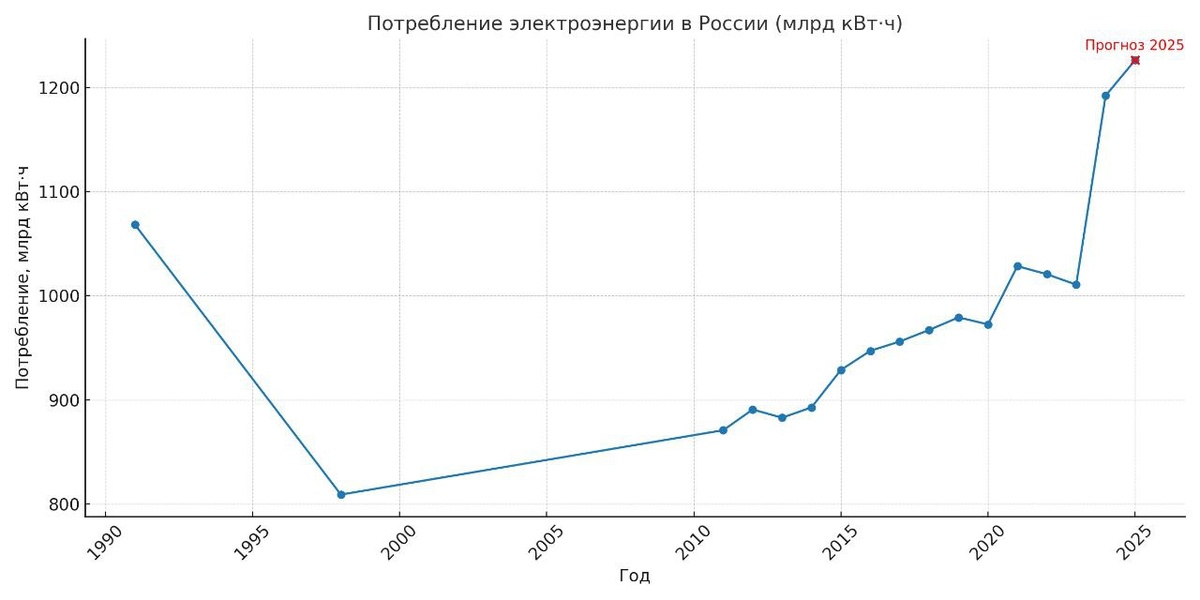Итак, еще одна очень интересная статистика, обнаруженная на просторах интернета. Потребление электроэнергии в России с 1990 года по 2025 год. А вот тоже самое, но не в виде графика, а в виде текста: 1991 — 1 068,2 млрд кВт⋅ч 1998 — 809,1 млрд кВт⋅ч 2011 — 870,9 млрд кВт⋅ч 2012 — 890,8 млрд кВт⋅ч 2013 — 882,9 млрд кВт⋅ч 2014 — 892,8 млрд кВт⋅ч 2015 — 928,7 млрд кВт⋅ч 2016 — 947,2 млрд кВт⋅ч 2017 — 956,0 млрд кВт⋅ч 2018 — 967,2 млрд кВт⋅ч 2019 — 979,2 млрд кВт⋅ч 2020 — 972,5 млрд кВт⋅ч 2021 — 1 028,4 млрд кВт⋅ч 2022 — 1 020,7 млрд кВт⋅ч 2023 — 1 010,6 млрд кВт⋅ч 2024 — 1 192,0 млрд кВт⋅ч 2025 (прогноз) — 1 226,0 млрд кВт⋅ч Ну вы поняли, да. Догнать по потреблению электроэнергии советский 1990 год мы смогли только в 2024 году. Это, на мой взгляд, больше всего показывает ту яму, в которой мы оказались после гибели Советского Союза. Почему потребление электроэнергии так важно? А потому что именно на электричестве работает вся современная промышленность. Отсюда потребление электроэнергии осн