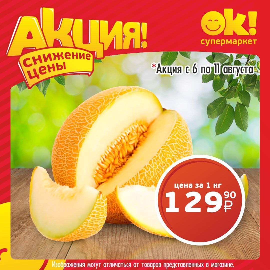 🍈 Сочные дыни по суперцене! 🍈 С 6 по 11 августа в Супермаркете ОК — сладкие, ароматные дыни всего за 129,90 ₽/кг! Успейте насладиться нежным вкусом лета — предложение ограничено! 🏃 Приходите скорее, пока дыни не закончились! 📢 Хотите больше выгод? Подписывайтесь на наш Telegram-канал: 👉 https://t.me/supermarket_ok Ждём вас в Супермаркете ОК! 🛒💛 #СупермаркетОК #Дыни #Скидки #ЛетоВкусно