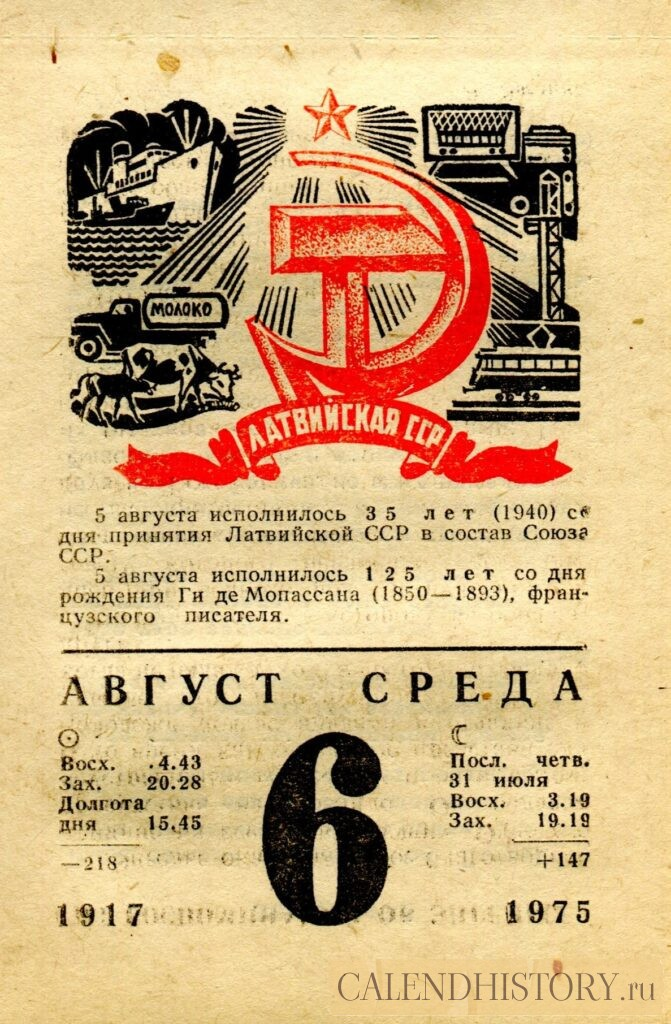 Итак, сегодня 6-го августа и у нас на календаре 1975-й год. Перед нами листок советского календаря для женщин. На календаре у нас среда - 6 августа 1975-го года. ЛАТВИЙСКАЯ ССР. 5 августа исполнилось 35 лет (1940) с дня принятия Латвийской ССР в состав Союза CCP. 5 августа исполнилось 125 лет со дня рождения Ги де Мопассана (1850-1893), французского писателя. *** Оборотную сторону листка этого календаря можно посмотреть у нас по ссылке на сайте. Другие листки советских календарей смотрите у нас на сайте - CALENDHISTORY.ru ПОСМОТРИТЕ ЕЩЁ ЛИСТКИ ОТРЫВНЫХ КАЛЕНДАРЕЙ: