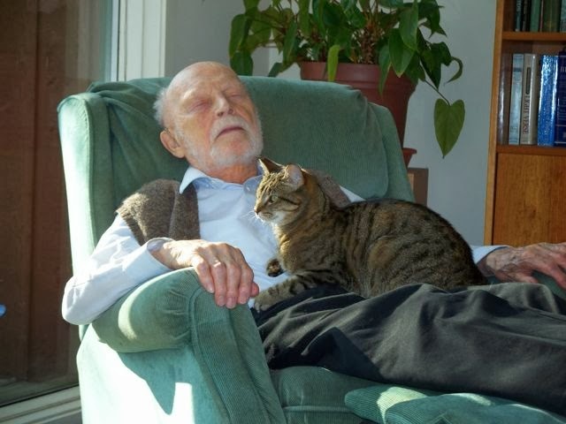 Сергей Викторович сидит в кресле. Кот у него на коленях, глаза прищурены, как у тех, кто уже в следующей жизни, но ещё немного держится за эту.
