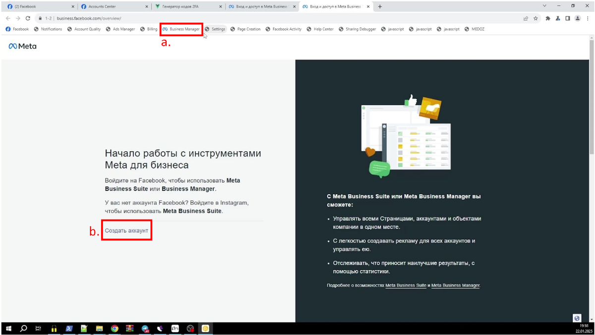 - Войдите в Facebook Business Manager: Перейдите на сайт business.facebook.com и войдите в свой аккаунт. Если у вас его еще нет, зарегистрируйтесь.