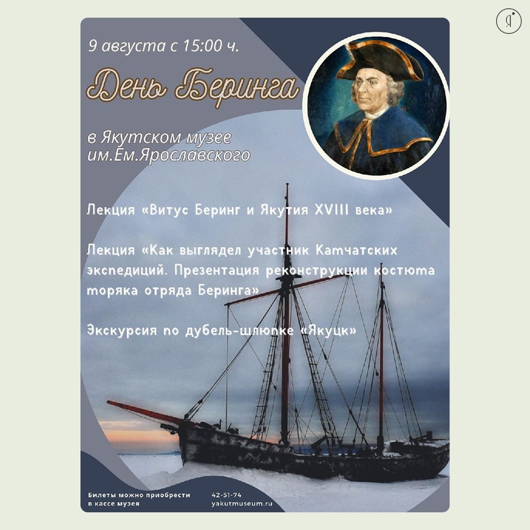 "День Беринга" в Якутском музее #Сдетьми 9 августа @yakutmuseum приглашает на ежегодное мероприятие, посвящённое памяти легендарного мореплавателя Витуса Беринга - руководителя Великой Северной экспедиции. Программа дня: 🤩 Главный корпус музея (1 этаж): 15:00 - Лекция «Витус Беринг и Якутия XVIII века» Лектор: Анна Шишигина, зам. директора музея, к.и.н. 15:30 - Презентация реконструкции костюма моряка XVIII века Лектор: Сергей Слепцов, зав. сектором истории 🤩 Территория музея: 16:00 - Экскурсия по дубель-шлюпке «Якуцк» Уникальная возможность побывать внутри исторического судна Стоимость: • Взрослые - 800 ₽ • Дети - 450 ₽ (доступна оплата Пушкинской картой) 🤩 Запись: +7 (4112) 42-51-74 Будет интересно и взрослым, и детям 🤩 Online Якутия | Подписаться