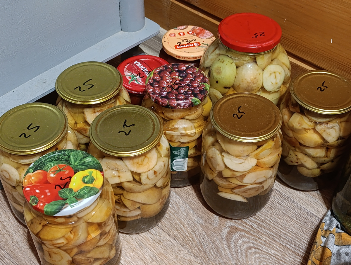 Добрый день всем! Вот ведь натура моя хомячья, всё в норку, в норку. Дают бери! Позвонила мне на днях тётя, говорит: “Яблоки не знаю куда девать, падают, набрала забери!" Яблоки я люблю, поехала. Приезжаю, а там три больших пятёрочных пакета! Надо брать! Привезла домой и решила закрыть дольками в сиропе. Нарезала долек, залила сиропом как компот. Сироп я делаю для компота всегда в пропорции- на 3-х литровую банку (или 3 литровые банки) 0,5 литра сахара. Сделала 9 литров. Возилась весь вечер. И тут осознала масштаб работы! Яблок-то почти не убавилось! На другой день испекла шарлотку, а яблок всё также- почти 3 пакета. Что делать? Варенье родственники не очень едят из яблок, да и сахара много надо. Решила приготовить повидло, сахара всего 300 грамм на 1 кг надо. После обеда стала резать яблоки, резала- резала, резала-резала, а они не кончаются, себя ругала, вот ведь, проблему и заботу себе нашла. Получился целый бак, 7 кг! Стала варить, а они пригорают, надо мешать, а бак глубокий, не у
