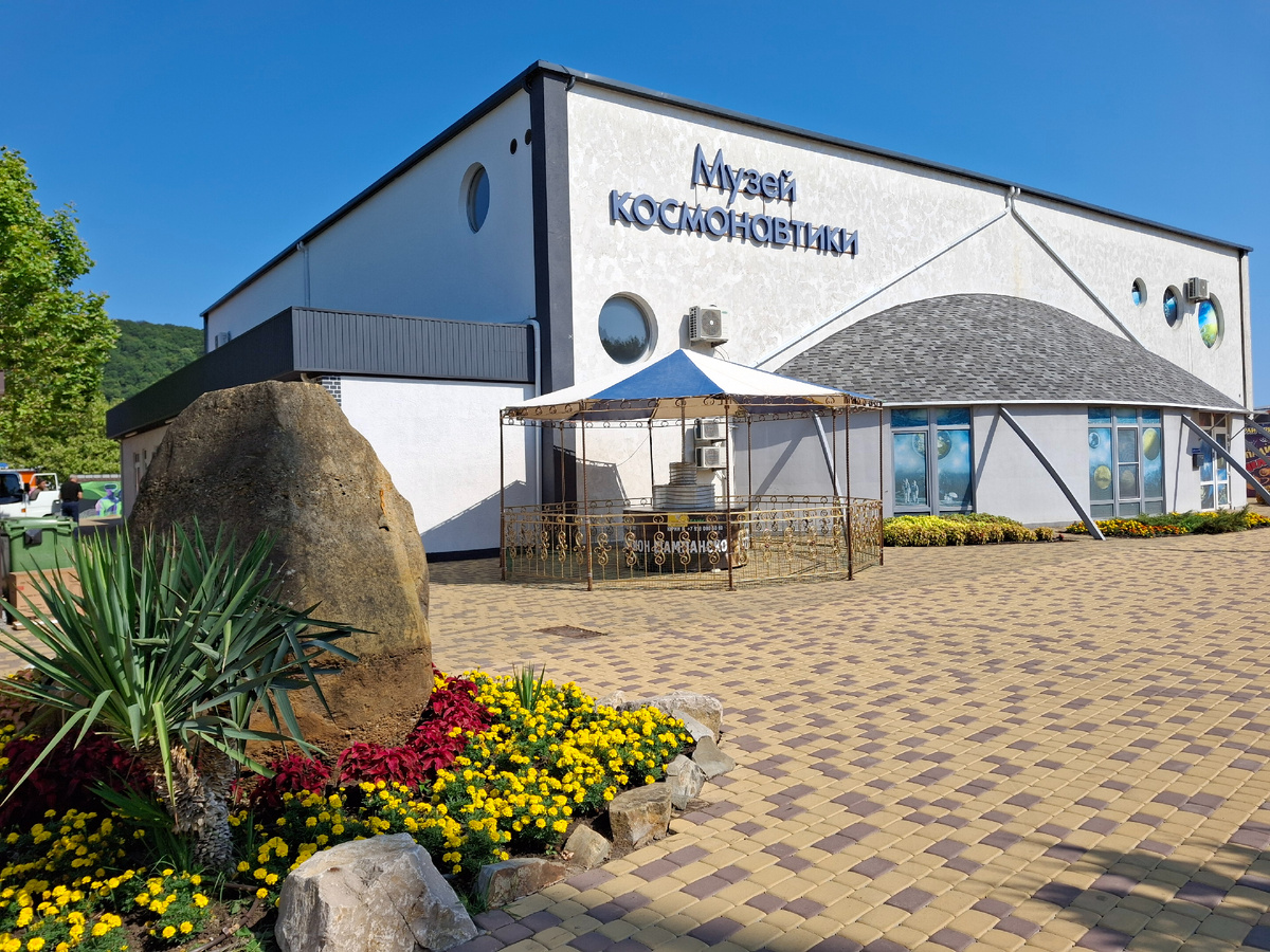 В Архипо-Осиповке замечательный музей космонавтики. Он находится на территории парка аттракционов "Малибу". На территории, напротив музея, - модуль орбитальной станции Алмаз. Заходим в музей. Макет первого выхода в открытый космос Алексея Леонова. Макет орбитальной станции Алмаз. Прямо - ракетный двигатель, слева внизу - зеленый возвращаемый аппарат, слева сверху - макет американского космического челнока Эндевор, справа - уменьшенный макет ракеты-носителя Союз. Прямо виден черный шар. Идем к нему. Внук залез внутрь. На экране все видно. На выход. Макет скафандра СК-1. Компоновка возвращаемого аппарата. Идем на 2 этаж музея.