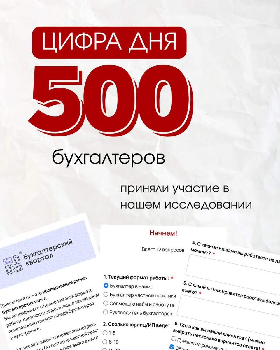 Мы замахнулись на новое исследование! 📈 Чуть больше года назад мы провели наше первое масштабное исследование — тогда мы анализировали, как на рынке бухгалтерских услуг обстоят дела с ценами. Благодаря вашему включению, а анкету тогда заполнили более 2000 бухгалтеров, нам удалось собрать достаточно данных, чтобы сделать объективные выводы, которыми мы поделились с вами на мастер-классе🎙️ ♦️И вот, мы готовы провести ещё одно исследование рынка бухгалтерских услуг и надеемся на ваше активное участие — в наших общих интересах! На этот раз будем изучать, предприниматели из каких ниш и направлений наиболее охотно работают со специалистами на аутсорсинге, а также, с какими клиентами предпочитают работать сами бухгалтеры. Кто готов платить достойные деньги за бухгалтерские услуги, и сколько клиентов в среднем может вести один бухгалтер без отказа от личной жизни и отдыха. Вопросов в анкете всего 12, ответы займут не более 10 минут. Результатами мы, конечно, с вами поделимся — осенью