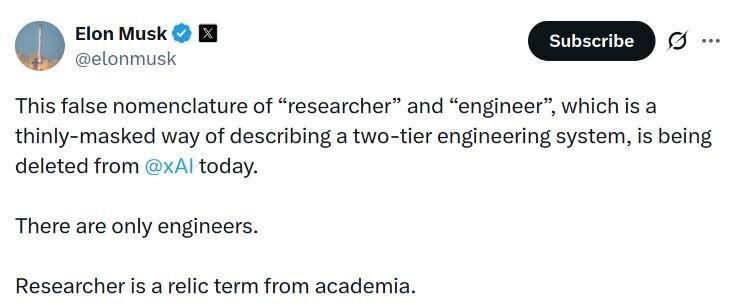 всем привет, тут случилась заочная битва двух якодзун: Илон Маск у себя в твиттере (Х) высказался, что не видит разницы между исследователем и инженером (на картинке); ему ответил Ян ЛеКун у себя в LinkedIn в том духе, что у исследователей отличается методология (исследователи работают над открытием новых принципов, нежели над конкретным продуктом), открытость взаимодействия с коллегами (исследователи публикуются для того, чтобы получить оценку своим идеям), а также методы оценки их работы (у исследователей все сложно)