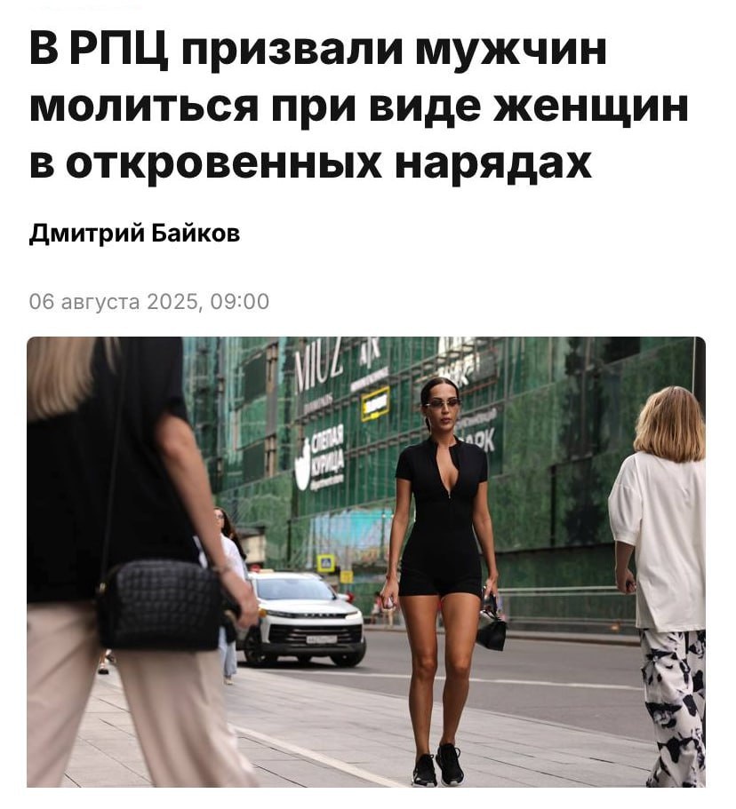 Мужчины должны молиться при виде женщин в откровенной одежде, считают в РПЦ. В Русской православной церкви заявили, что мужчины обязаны молиться, как только заметят женщину в откровенном наряде. Иеромонах Феодорит объяснил, что искушение — это грех, и молитва поможет сохранить благочестие. ────────── ⚡️Важные новости – без лишнего шума!⚡️ Подпишись на канал и получай только суть: оперативно, чётко, по делу! 👉 ИнфоСплетник | @infospletnik