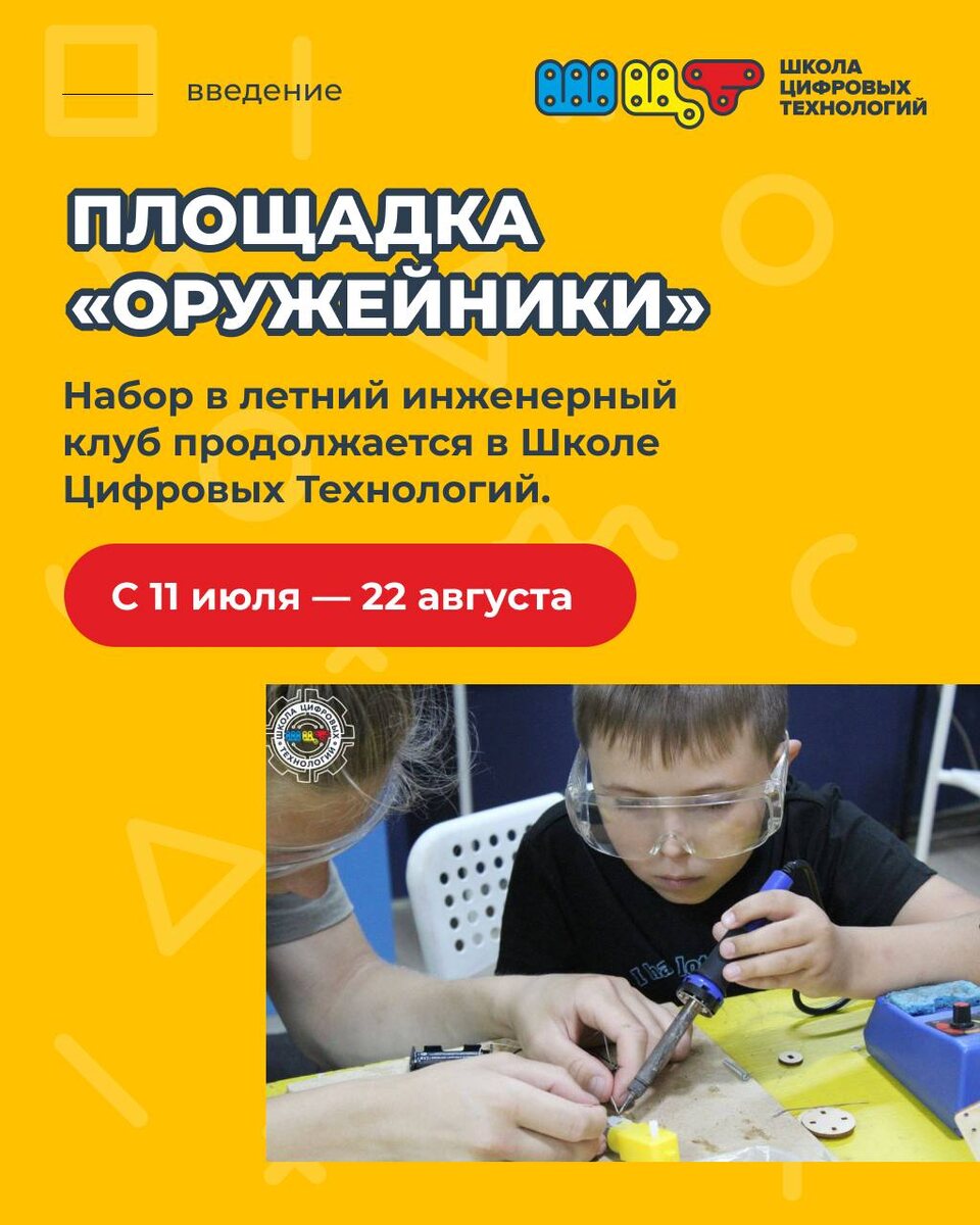 🔤🔤🔤🔤🔤🔤🔤🔤🔤🔤 Набор в летний инженерный клуб продолжается в Школе Цифровых Технологий. С 11 августа — 22 августа смена «Оружейники » Увлекательный курс для тех, кто интересуется оружием и его историей! Для школьников старше 8 лет, которые хотят стать настоящими оружейными конструкторами! За 10 дней площадки : ▫️Познакомимся с различными видами оружия ▫️ Изучим историю оружейного дела в России и за рубежом ▫️ Научимся проектировать и создавать модели оружия ▫️ Применим ручной инструмент и технологии для создания собственных проектов 📍Наши центры ул. Лыткина, 16/1 ул. Ленина, 74 ул. Новосибирская, 32 ул. Петра Федоровского, 4 (Эврика-развитие) 🕗 с 8:30 до 18:30 👧 Возраст: 8–11 лет 🍽 Обед и два перекуса, прогулки, экскурсии и игры включены! Запись и вопросы — 📞+7 3822 48-97-87 💬 WhatsApp: +79527543058 Телеграм-бот: t.me/cmit_ru_bot 🌐 Подробности: https://tehnoleto.ru/ В этом посте есть большое видео, которое не загрузилось в Дзен. Откройте оригинал поста в телеграме