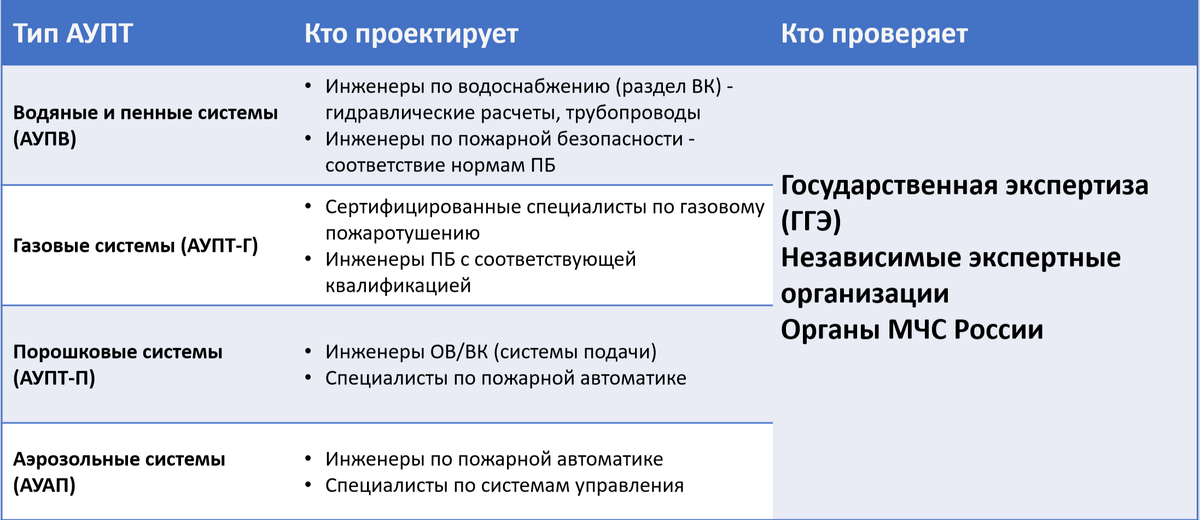 Вопрос проектирования и разработки автоматических установок пожаротушения (АУПТ) остаётся дискуссионным, особенно в контексте нормативных требований. Постановление Правительства №87 регламентирует состав разделов проектной документации, но не даёт чёткого ответа: какой именно специалист должен заниматься АУПТ? Например, внутренний противопожарный водопровод (ВПВ) проектирует специалист по водоснабжению, а проверяет его эксперт в той же области. Но АУПТ — это сложные системы, включающие не только водяные, но и газовые, порошковые, аэрозольные решения. Они требуют знаний: На практике распределение обязанностей по проектированию и проверке различных типов АУПТ выглядит следующим образом: Идеальная схема должна включать: Идеальный вариант – команда специалистов: