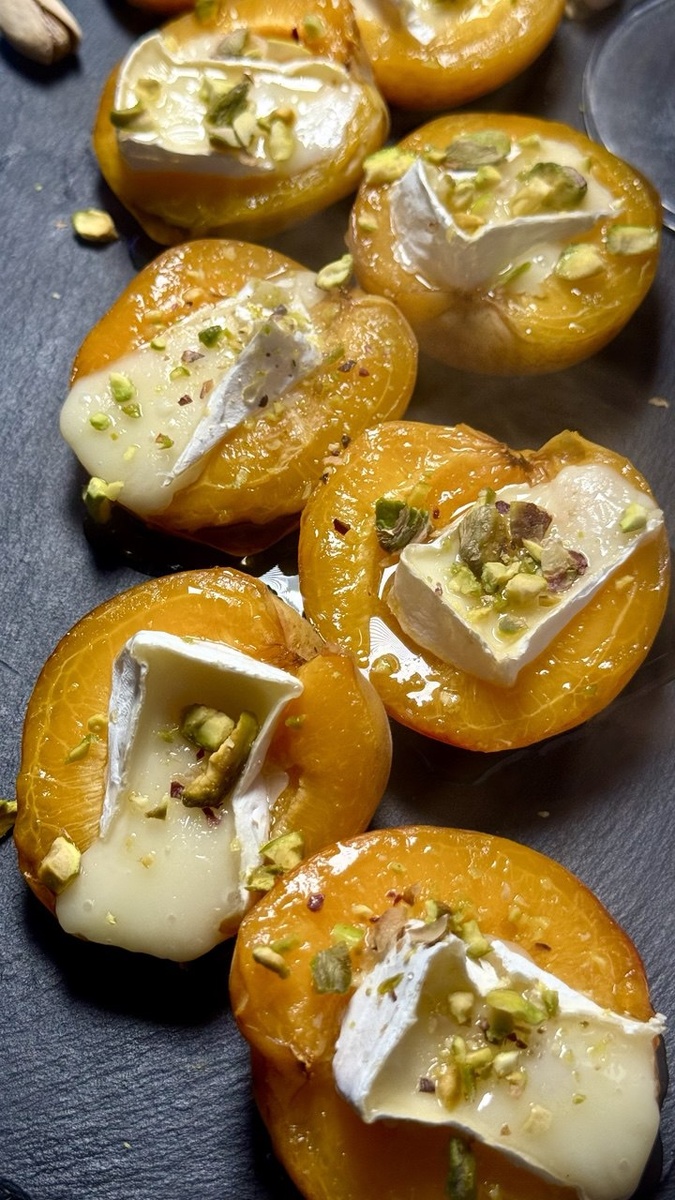 Приготовление Разделите пополам абрикосы и удалите косточку . Затем абрикосы выложите в форму для запекания . На них камамбер порезанный небольшими кусочками , и убираем в духовку на 10 мин при 180 гр . После запекания сервируем на красивом блюде сверху поливаем мёдом . Сверху посыпаем крошкой от фисташек . Это блюдо получается очень сочное , нежное , и вкусное , подойдет не только под вино , но и как десерт к вашему столу !