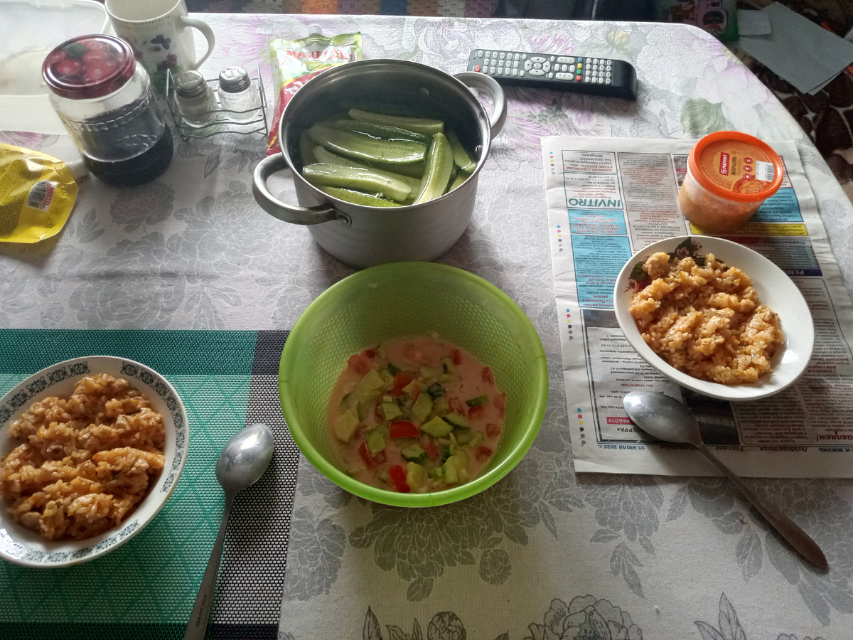 Приготовила плов в мультиварке. Наложила детям завтрак. Дочь доела салат из помидоров и огурцов со сметаной, сын с корейской морковкой и малосольными огурцами.