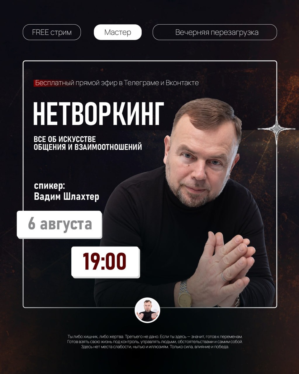 🔴🔴🔴🔴🔴 Бесплатный стрим «Нетворкинг». Задавайте свои вопросы по теме в комментариях к этому посту — на все отвечу в прямом эфире. ⏳ 6 августа в 19:00 (длительность до 30 минут) 🕙 Подключайся в Телеграме или Вконтакте. Я провожу «Вечернюю перезагрузку» каждую среду. Запись эфира выложу в частном канале. Обо мне | Сказать спасибо | Навигация
