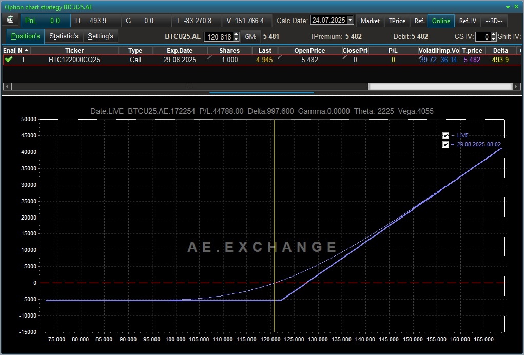 С классическими календарными спредами мы с вами закончили, уложились в пять статей. В ближайшее время я дополню ссылками на них рубрикатор статей. Но мир календарных спредов он более обширен. Сегодня мы начнем о нем разговаривать. Начнем с диагональных спредов. Допустим мы уверены что ВТС к августовской экспирации улетит за $130,000, и мы алчем взять это движение при помощи покупки опциона колл августовской серии страйка 122,000. Ходить мы планируем 1 ВТС (1000 АЕ контрактов). Вот