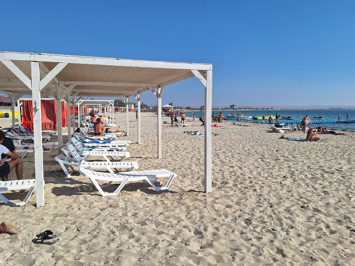 Вообще посещение пляжа в Межводном вызвало, лично у меня, довольно грустное настроение - когда-то шумный и многолюдный пляж, уменьшился в размерах раз в десять, жизнь здесь как будто замерла как в самом начале девяностых годов, и уровень инфраструктуры и курортного сервиса остановился примерно на том же времени. Хотя бунгало с красными занавесками с бывшего пляжа "Алые паруса" переместили кажется именно сюда. Но и они в большинстве своём пустуют.