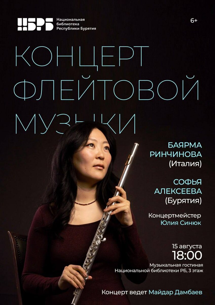 🪈Выпускница итальянской консерватории выступит в Национальной библиотеке Бурятии Флейтистка Баярма Ринчинова проведет концерт и мастер-класс. 15 августа в Национальной библиотеке Бурятии состоятся мастер-класс и концерт флейтистки Баярмы Ринчиновой. Баярма Ринчинова — уроженка Бурятии — выпускница ДШИ им. Бау Ямпилова и Колледжа искусств им. П. И. Чайковского. Мастер-класс для учащихся и студентов пройдёт 15 августа в 10.00 в усадьбе Молчанова. В этот же день в 18.00 в литературно-музыкальной гостиной библиотеки пройдёт концерт Баярмы Ринчиновой. В нём примут участие Софья Алексеева (флейта) и концертмейстер Юлия Синюк. Стоимость билета на концерт: 300 рублей. Приобрести его можно будет при входе. Количество посадочных мест в зале ограничено. Возрастное ограничение: 6+