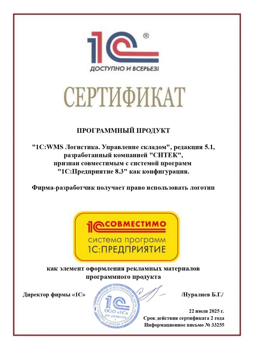 Продукт «1С:WMS Логистика. Управление складом» компании «СИТЕК» получил сертификат «Совместимо! Система программ 1С:Предприятие»!
