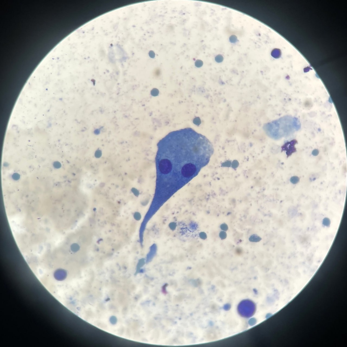 Апокриновый эпителий с атипией Объектив 100x. Окрашивание МГГ. #цитология