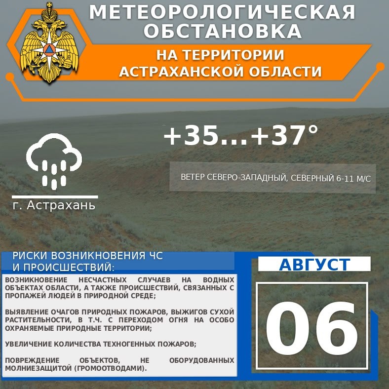🪷Метеорологическая обстановка на 6 августа 🌤На территории области переменная облачность. ⛈Местами кратковременный дождь, гроза. 🌬Ветер северо-западный, северный 6-11 м/с. 🌡Температура воздуха днем +32...+37°, ночью +19...+24°. 🌤По г. Астрахань переменная облачность. ⛈Кратковременный дождь, гроза. 🌬Ветер северо-западный, северный 6-11 м/с. 🌡Температура воздуха днем +35...+37°, ночью +21...+23°.