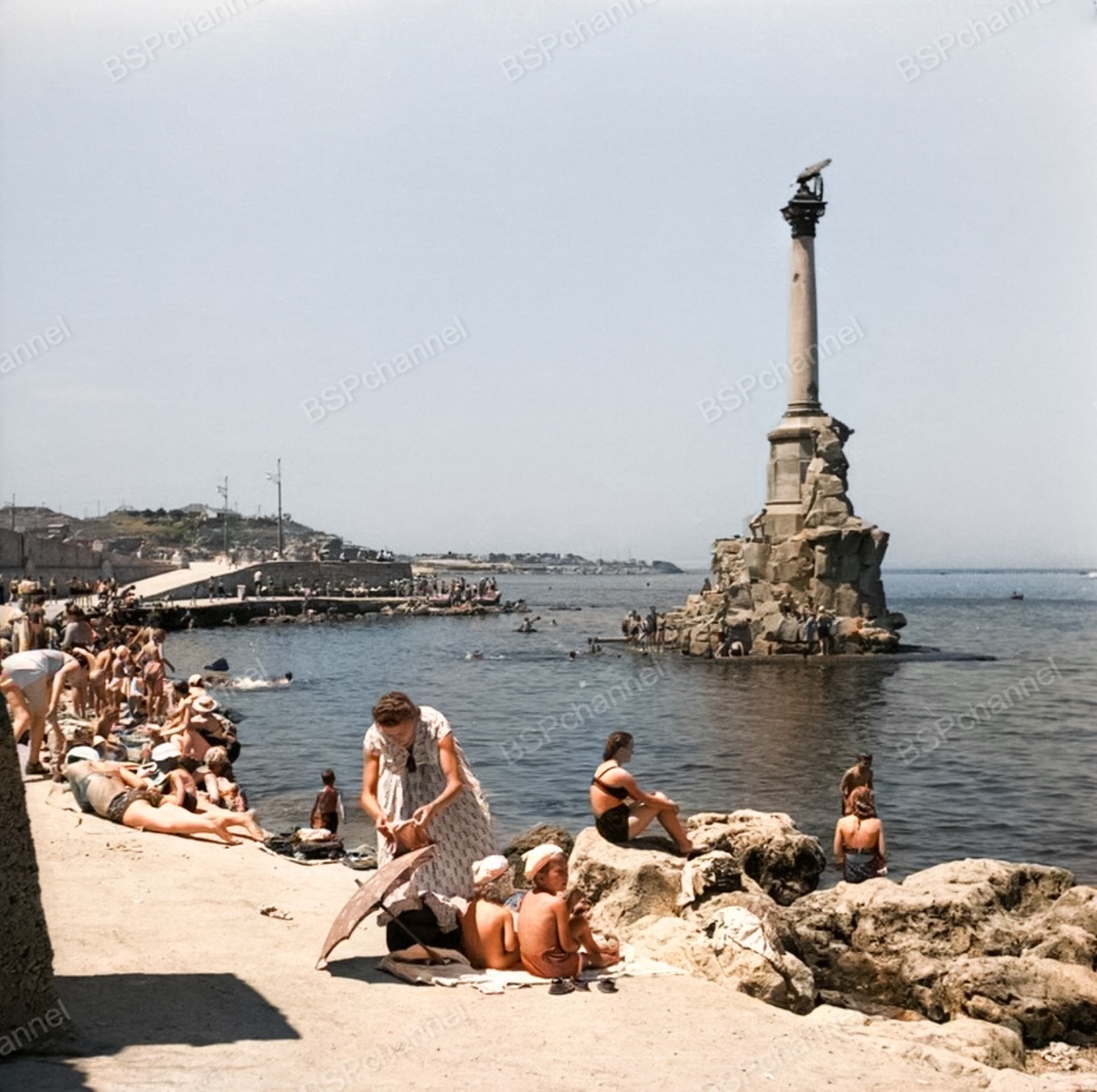 Пляж на Приморском бульваре. Памятник затопленным кораблям. Севастополь, 1953 год.