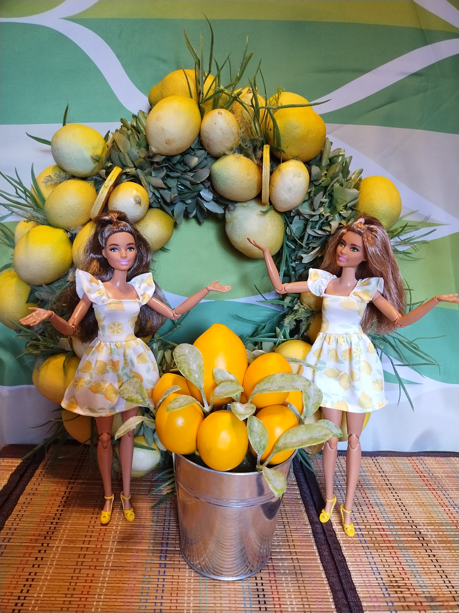 У меня есть две похожие куклы, одна была уже куплена на МТМ теле, другую я пересадила- и вот эта вторая выше первой, хотя тело вроде бы одинаковое. Ну вы сами увидите. Этот молд очень популярен, у многих есть такие куклы - но я снова забыла название молда. Напишите мне плиз, кто просмотрит эту мою статью. Почему фотосессия с лимонами?- Потому что я купила два набора летней одежды, где платья для Барби- в лимончиках. Ну тогда и окружающий дизайн должен быть лимонный, решила я. Сказано- сделано. Купила пакет настоящих лимонов, и взяла еще декоративные украшения- Венок с лимонами и букет. Фотографий получилось много, но для полноты картины они важны все. Куклы фотогеничны, хотя работать с ними было сложно, они не держали позу, все время падали, вобщем пришлось помучиться. Но чего не сделаешь ради своего хобби! Встречаем Барби в лимонном антураже Декоративный букет- лимоны в ведерке. Не настоящие А здесь уже настоя