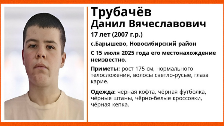 В селе Барышево под Новосибирском без вести пропал 17-летний Данил Трубачёв. Как сообщили в поисково-спасательном отряде (ПСО) «ЛизаАлерт», с 15 июля 2025 года его местонахождение неизвестно, поэтому к поискам подключились волонтеры. Приметы пропавшего: рост 175 сантиметров, нормального телосложения, волосы светло-русые, глаза карие. Сибиряк был одет в черную кофту, черную футболку, черные штаны, черно-белые кроссовки и черную кепку. Если у вас есть информация о местонахождении Даниила Трубачёва, сообщите об этом по телефону ПСО 8-800-700-54-52 или наберите 112. Ранее «Вести Новосибирск» писали, что в Новосибирске нашли живым 10-летнего мальчика в черно-красных шортах, местонахождение которого было неизвестно с 31 июля 2025 года. В ГУ МВД России по региону сообщили, что в настоящее время его жизни и здоровью ничто не угрожает. С несовершеннолетним и законными представителями работают инспекторы ПДН, выясняют причины ухода из дома.