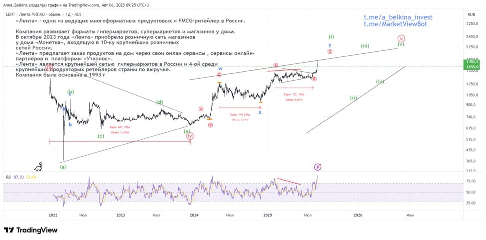 #ПотребСектор_Нецикличные #LENT Лента Не реализовалась ожидаемая коррекция по Ленте. С 14 июля акции вернулись к росту с ускорением в последнюю неделю на хорошем отчете, который показал позитивную динамику роста по всем параметрам – выручки, новых магазинов «у дома», при этом сохраняется низкая долговая нагрузка. Даже «Корпоративный центр Х5» не может таковым похвастаться. По технике, продолжает свое развитие волна (i) Конечной диагонали – рост идет тройкой в двойном зигзаге. Пришлось пересмотреть структуру волны [b] of y of (i) до бегущего треугольника с выходом [с] of y of (i) – импульс в этой волне не завершен. При этом еще раз смотрела на структуру движения после выхода из треугольника в [iv] – импульса нет, идет движение тройками. Допускаю, что небольшая ценовая история не дает всей полноты картины. Тем не менее, движение в череде третьих и четверых волн также нет возможности предположить. Значит, пока всё же рост в конечной диагонали. Не является ИИР 💪 Бот Закрытого Кана