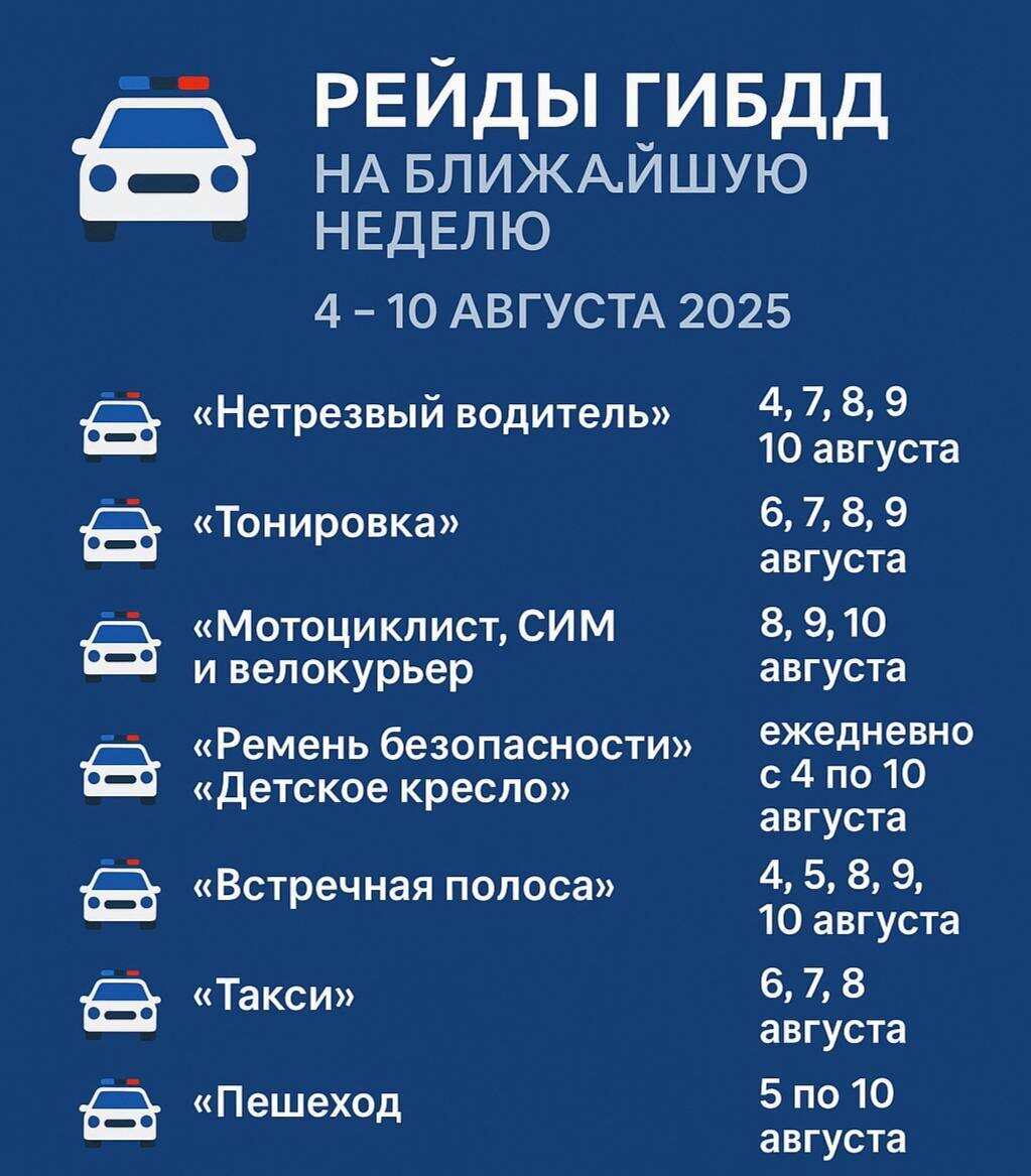 🚨Рейды ГИБДД на ближайшую неделю! Инспекторы выходят в усиленные рейды по всей стране. Водителям стоит быть особенно внимательными 👇 1️⃣«Нетрезвый водитель» — 4, 7, 8, 9, 10 августа 2️⃣«Тонировка» — 6, 7, 8, 9 августа 3️⃣«Мотоциклист, СИМ и велокурьер» — 8, 9, 10 августа 4️⃣«Ремень безопасности» и «Детское кресло» — ежедневно с 4 по 10 августа 5️⃣«Встречная полоса» — 4, 5, 8, 9, 10 августа 6️⃣«Такси» — 6, 7, 8 августа 7️⃣«Пешеход» — с 5 по 10 августа