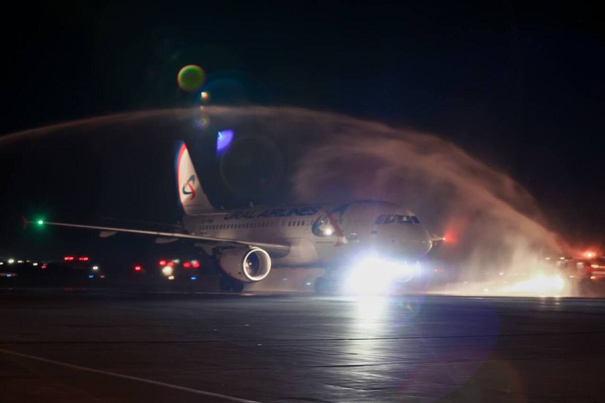Аэропорт Кольцово встретил водной аркой первый после перерыва в несколько лет самолет из Геленджика, сообщает ИА "Уральский меридиан