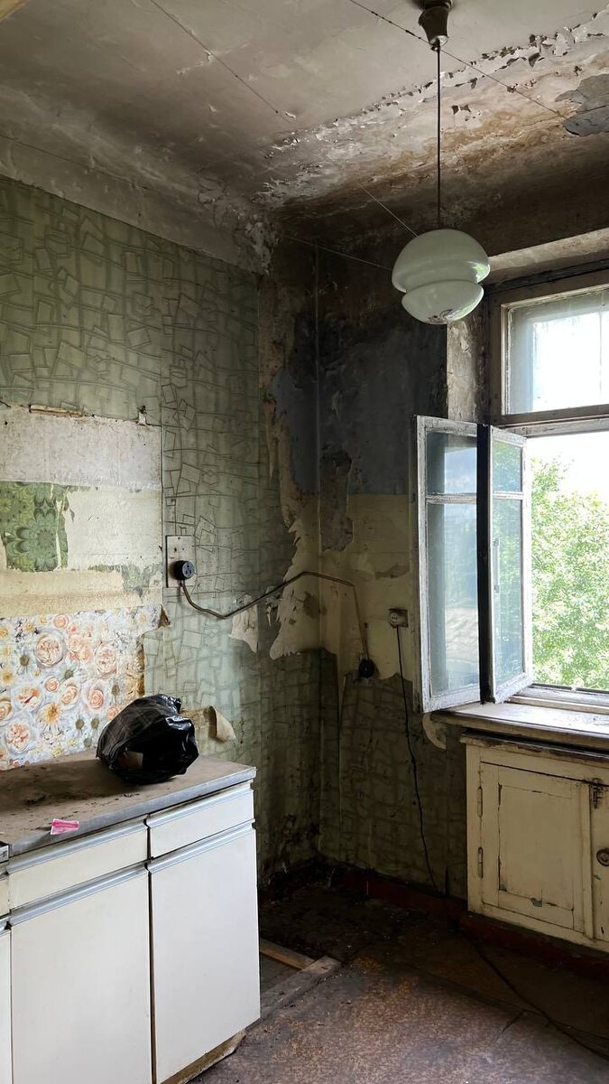 Кухня 🥲 Оставлю вам тут для того, чтобы рассмотреть можно было. Надо сегодня снять линолеум, может даже обои тоже. Сама пока тут ничего не ломаю, так как боюсь что что-нибудь упадет мне на голову 😅 просто был тут уже прецедент с дверью - она просто упала рядом 😐 Нужно просто помыть то, что моется, чтобы можно было находиться тут, так как запашок тут не испарился.