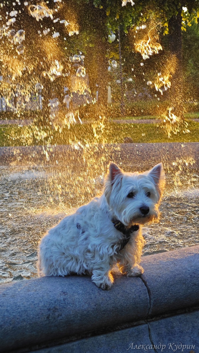 Суровый Маркс и солнечный терьер: Удивительный дуэт у вечернего Смольного! Знаете, есть слова, которые въедаются в память с детства. "Девушка Смольный"... "Смольный"... Звучало это в старых фильмах о революции часто, грозно, почти зловеще. И вот я здесь, у самого что ни на есть сердца тех событий. Возвращаясь вечером в гостиницу, я не удержался и свернул к самому институту. Сумерки сгущались, окрашивая всё в глубокие синие тона, а заходящее солнце цеплялось алыми полосами за крыши. В лучах заката каменный лик Карла Маркса хмурился особенно грозно, словно был недоволен и моей прогулкой, и этим новым веком. Но жизнь, она всегда вносит свои поправки в монументальность истории. Мой взгляд вдруг выхватил нечто совершенно иное, живое и трогательное. На краю фонтана, будто на пьедестале, сидел... белоснежный вест хайленд терьер! А за его спиной били струи, и капли воды, подсвеченные тем самым закатным солнцем в золото, создавали ему ослепительный, искрящийся ореол. Этот пушистый аристокра