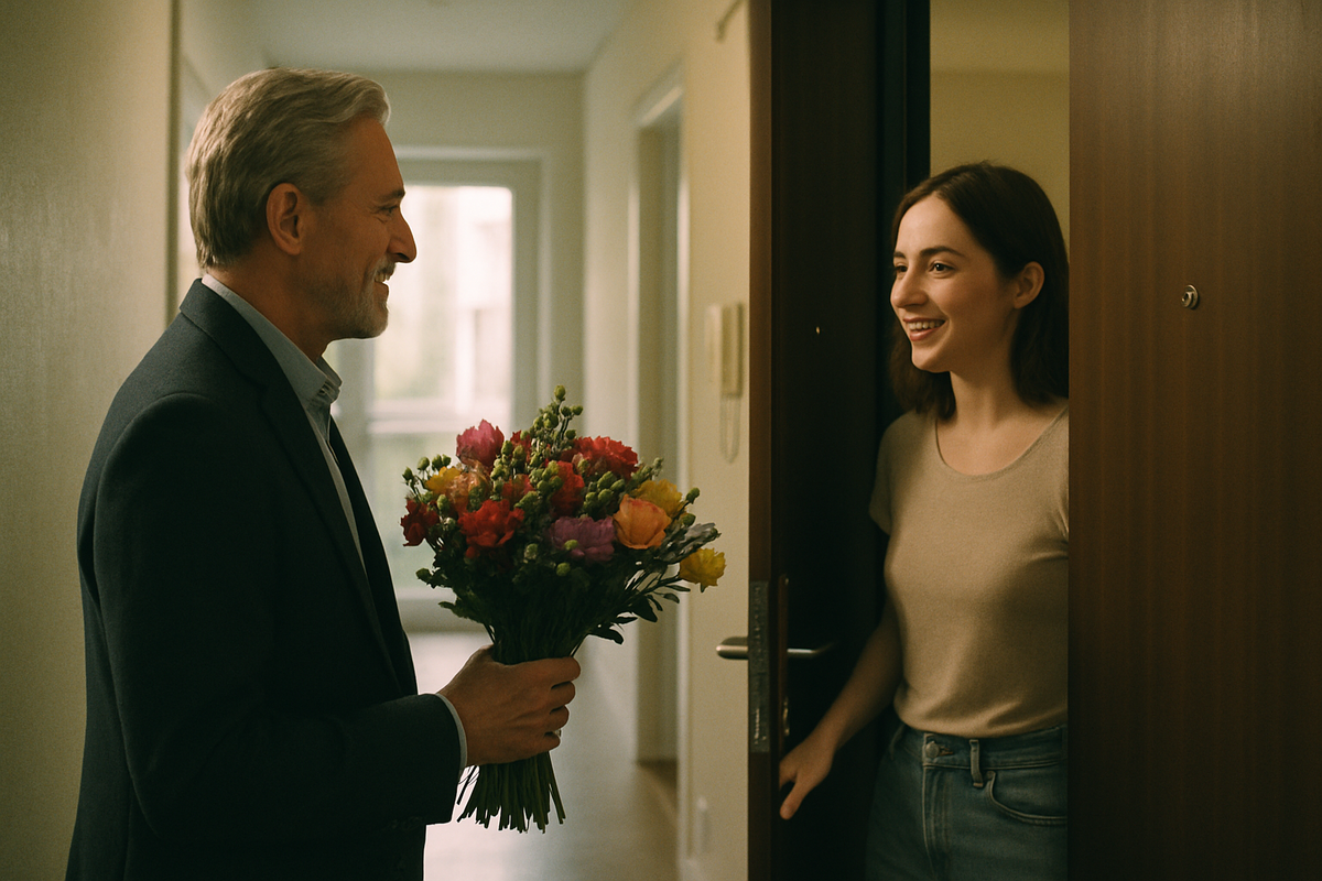 Услышав такое к себе обращение, Валя улыбнулась и даже немного прослезилась. Она пригласила Бориса Ивановича войти. Молодая женщина взяла букет в руки, а Борис, не сумев сдержать эмоций, крепко обнял Валю.