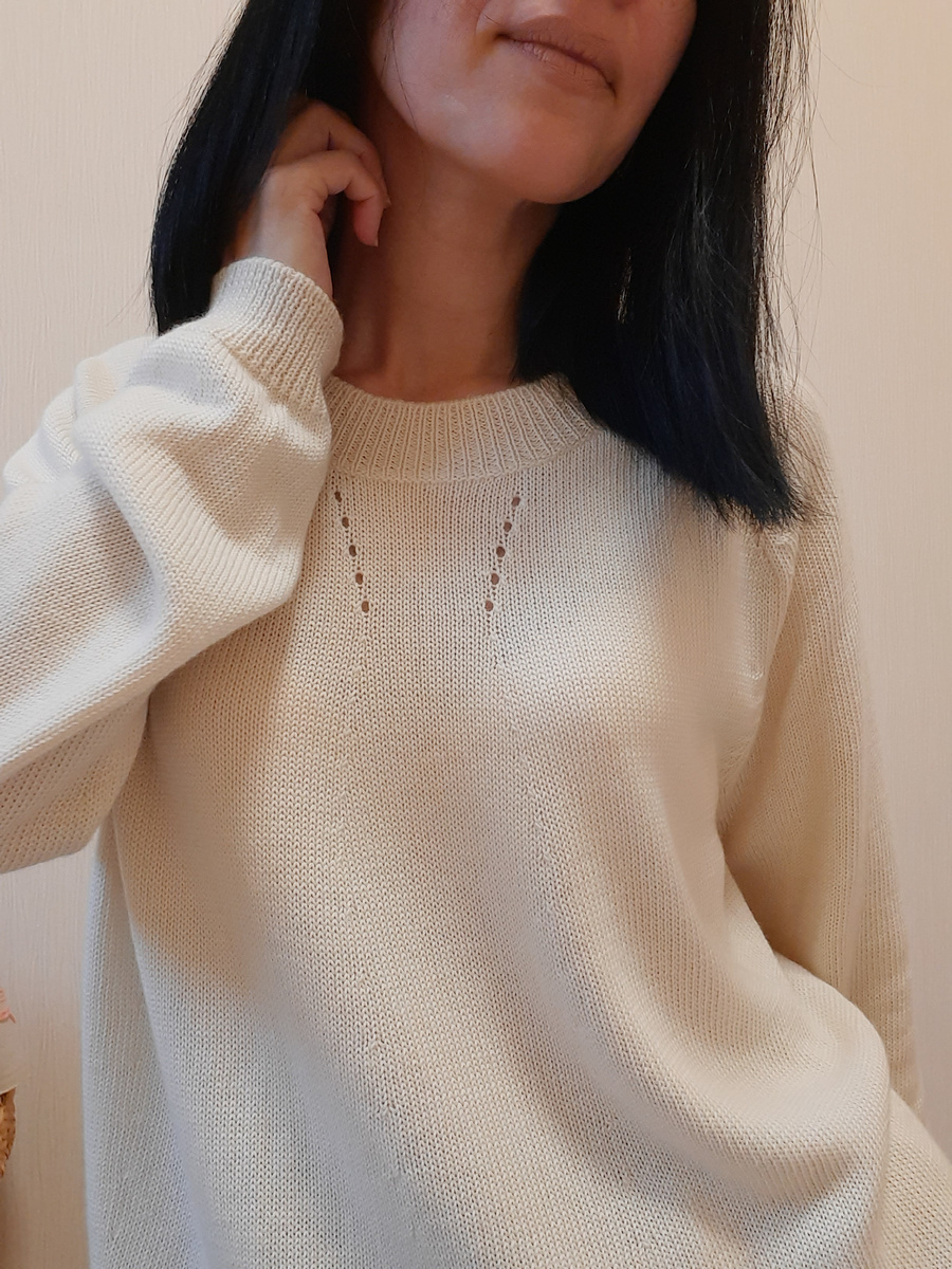 Аааа, добралась я до этого джемпера! Привет, друзья! Он связан по готовому изделию, но там была резинка, а у нас лицевая гладь, чтобы легче была вещь. Ну и тот был из чего попало, а здесь Кашемир, гребенной, шикарный!!! Тонкий 1750м/100гр, нежнейший, шелковистый. Связан джемпер в 4 нити, на машине 5 класса, плотность 6, весит 400гр. И да, он от Loro Piana. Ах, да, размер 50 российский, длина 70 см. Линии реглана фигурные на полочке , мне не очень понравилось, так как дополнительные заломы образуются.. На мне конечно, как на вешалке, на хозяйке лучше посадка! В размер должна быть такая форма реглана. На этом фото видна линия реглана. Интересный опыт! Ну и на этом все.. До новых встреч! Всем счастья и пока!!!