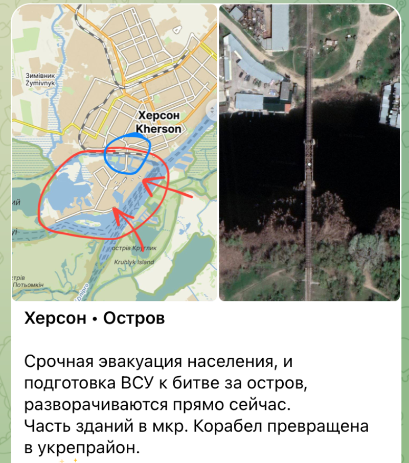 – Срочная эвакуация населения, и подготовка ВСУ к битве за остров, разворачиваются прямо сейчас, – написал экс-вагнеровец. Информацию ранее подтвердил и губернатор Херсонской области Владимир Сальдо: 4 августа он сообщил, что с самого утра из Корабела идут пешие колонны гражданских по железнодорожному мосту. А ВСУ, по его словам, укрепляют позиции в этом районе.