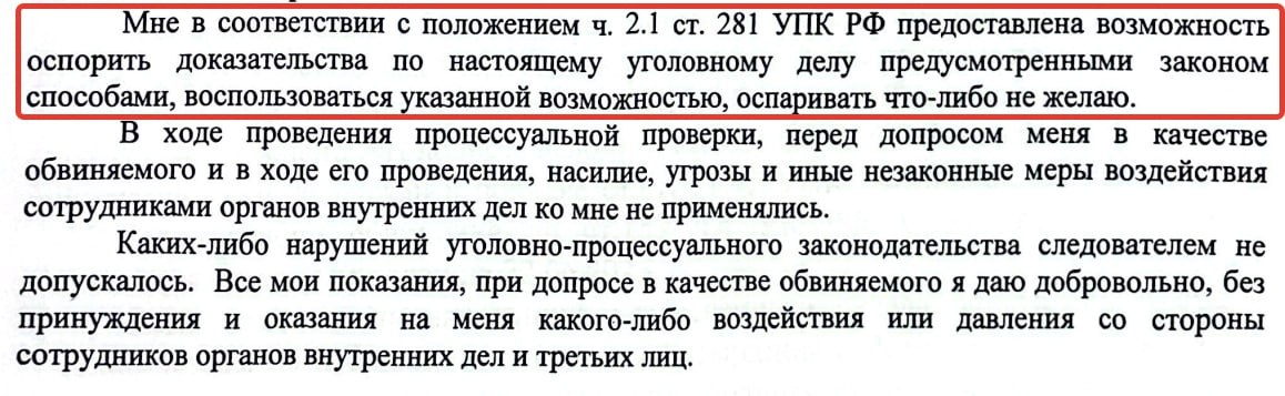 Я не люблю критиковать коллег, но... Вступил в дело, и в допросе вижу вот такое (см. скрин). Допрос проводился в присутствии адвоката по соглашению. Изложенная в протоколе фраза даёт в будущем судебном процессе право суду огласить любые показания любых неявившихся лиц при любых возражениях подсудимого и его защитников. Честно говоря, такой выверт со стороны следствия я встречаю впервые. Напомню, о какой норме речь (ч.2.1 ст.281 УПК РФ): решение об оглашении показаний [неявившихся] потерпевшего или свидетеля и о воспроизведении видеозаписи или киносъемки следственных действий, производимых с их участием, может быть принято судом при условии предоставления обвиняемому (подсудимому) в предыдущих стадиях производства по делу возможности оспорить эти доказательства предусмотренными законом способами. Когда норму принимали - такой возможностью оспорить доказательства рассматривали, как правило, очную ставку. Так её хотя бы назначали и проводили. Потом придумали, что адвокат обязательно