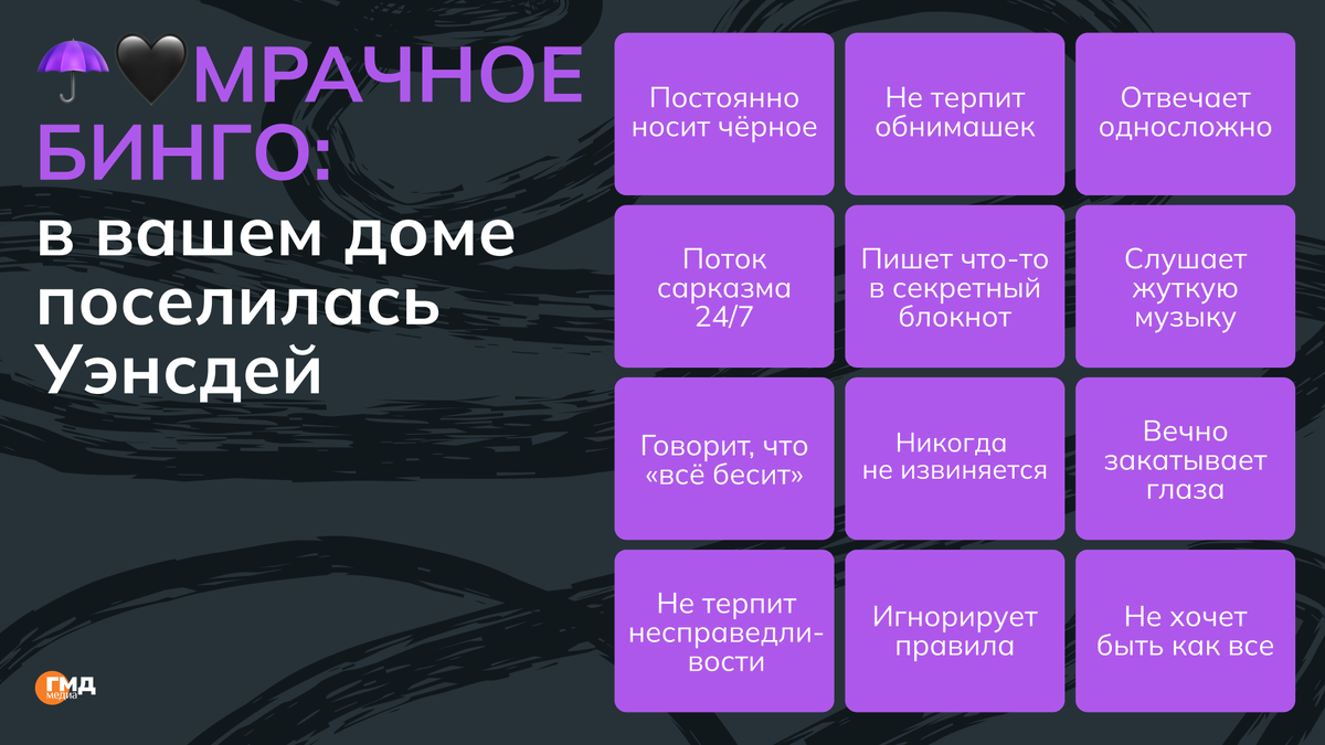 Мы сделали бинго, чтобы вы могли проверить — это всё ещё ваш милый малыш или уже кто-то очень похожий на Уэнсдей 😈