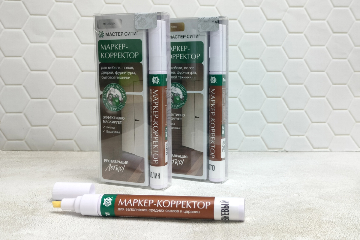 Если вы заметили потёртости, сколы или царапины на окрашенной мебели, дверях или плинтусах — не спешите менять всё с нуля! Маркер-корректор от Мастер Сити поможет быстро и аккуратно восстановить их внешний вид. Маркер-корректор — это быстрое и точное решение для закрашивания мелких повреждений красочного слоя на интенсивно используемых поверхностях: углов, стыков, ребер, клеевых швов, кромок. Он идеально подходит для деревянных, металлических и пластиковых изделий — от мебели до фурнитуры и бытовой техники. Палитра включает 4 цвета: белый, бежевый, золото и металлик — для любых поверхностей. В комплекте — спиртовая салфетка для очистки поверхности перед нанесением. Маркер-корректор Мастер Сити доступен на популярных маркетплейсах: Wildberries и Ozon. Реставрировать с Мастер Сити - легко! Мы уже создали всё для качественной реставрации. Вам остается только выбрать.