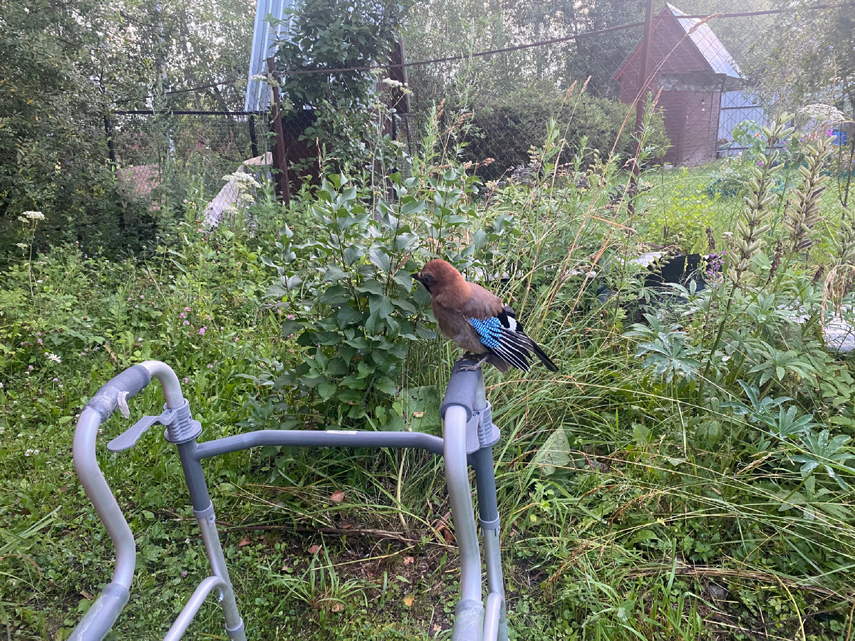 Этим летом у нас на даче гости. Заехала погостить родственница, чему я была очень рада! Так совпало, что у нее в это время был день рождения. Гостей много не намечалось, только я, муж и сын. Но так сложилось, что мужу пришлось срочно ехать в город на сутки. А мы решили не откладывать празднование и устроить чаепитие с угощениями на улице. Устроились на качелях, накрыли стол. Чай, салат «мимоза» — фирменное блюдо родственницы. Нарезки, овощи, торт. Нехитрая, но такая приятная трапеза в хорошей компании! Время летело незаметно. Мы сидели, болтали, смелись. Как вдруг услышали какой-то шум. А потом я почувствовали взгляд. Посмотрела наверх и встретилась глазами с птицей. Она перегнула шейку и разглядывала на нас с крыши качелей. Покрутила головой, перешла на другое место и снова принялась внимательно нас смотреть . — Привет! — сказала родственница птичке. После этого сойка спорхнула с качелей и села возле нас на ходунки (родственница ходит с ними). Я никогда раньше не видела у
