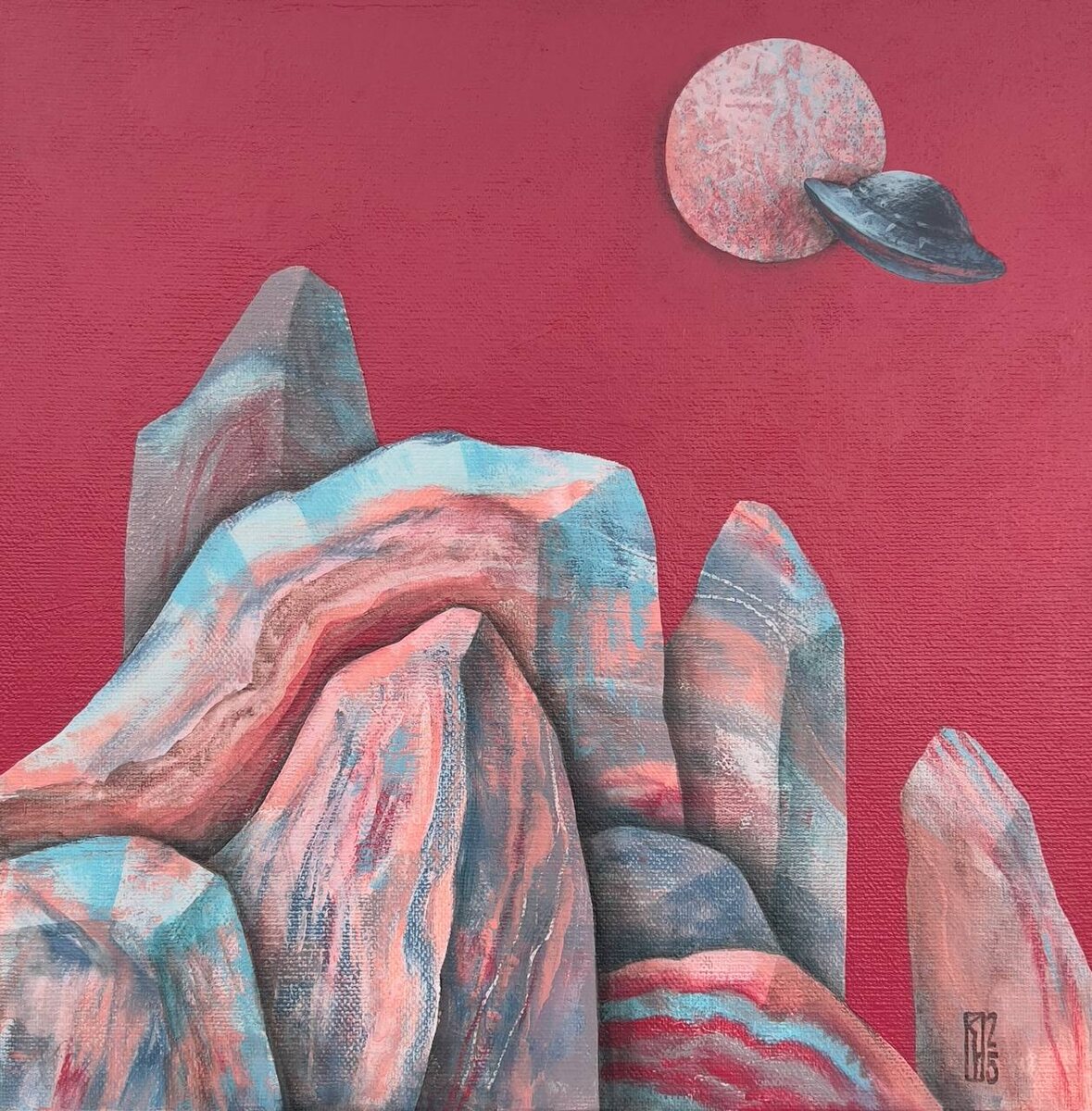 Разведка месторождений 30х30 холст/акрил, коллаж 2025 ••• Последняя картина на выставке - «Разведка месторождений» наполнена характерным порошинским бордово-малиновым цветом. Сюжет отсылает к фантастическим рассказам, возможно Рея Бредбери о Красной планете. Здесь мы уже не рассматриваем отдельные кристаллические формы, перед нами целое месторождение из крупных слоистых минералов бледно-голубых, прозрачно-розовых, серовато-алых. Говорящее название раскрывает сюжет, и превращает картину чуть ли не в блокбастер, где инопланетная тарелка, прилетевшая из космических далей, совершает разведку месторождений. Что же будет? ••• Рассмотреть ценность «Драгоценностей» Натальи Порошиной в галерее YOLKA art можно до 10 августа. ••• Москва. Ходынский бульвар 20а, с 11:00 до 21:00 ежедневно. Выставка бесплатная, работы продаются. Вся контактная информация на сайте YOLKA.art