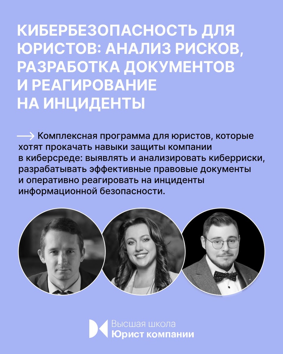 Приглашаем на обучение в новой программе «Кибербезопасность для юристов: анализ рисков, разработка документов и реагирование на инциденты» от Высшей школы Юрист компании. ⚡ Защита от киберугроз сейчас особенно актуальна. Поэтому цель программы, специально созданной юристами для юристов, - помочь вам выстроить лучшую защиту для компании. На уроках научитесь выявлять и анализировать риски, разрабатывать эффективные правовые документы и оперативно реагировать на инциденты информационной безопасности. ↖️ Сегодня по заявке откроем бесплатный тестовый доступ к обучению на 2 дня, успевайте записаться >>>