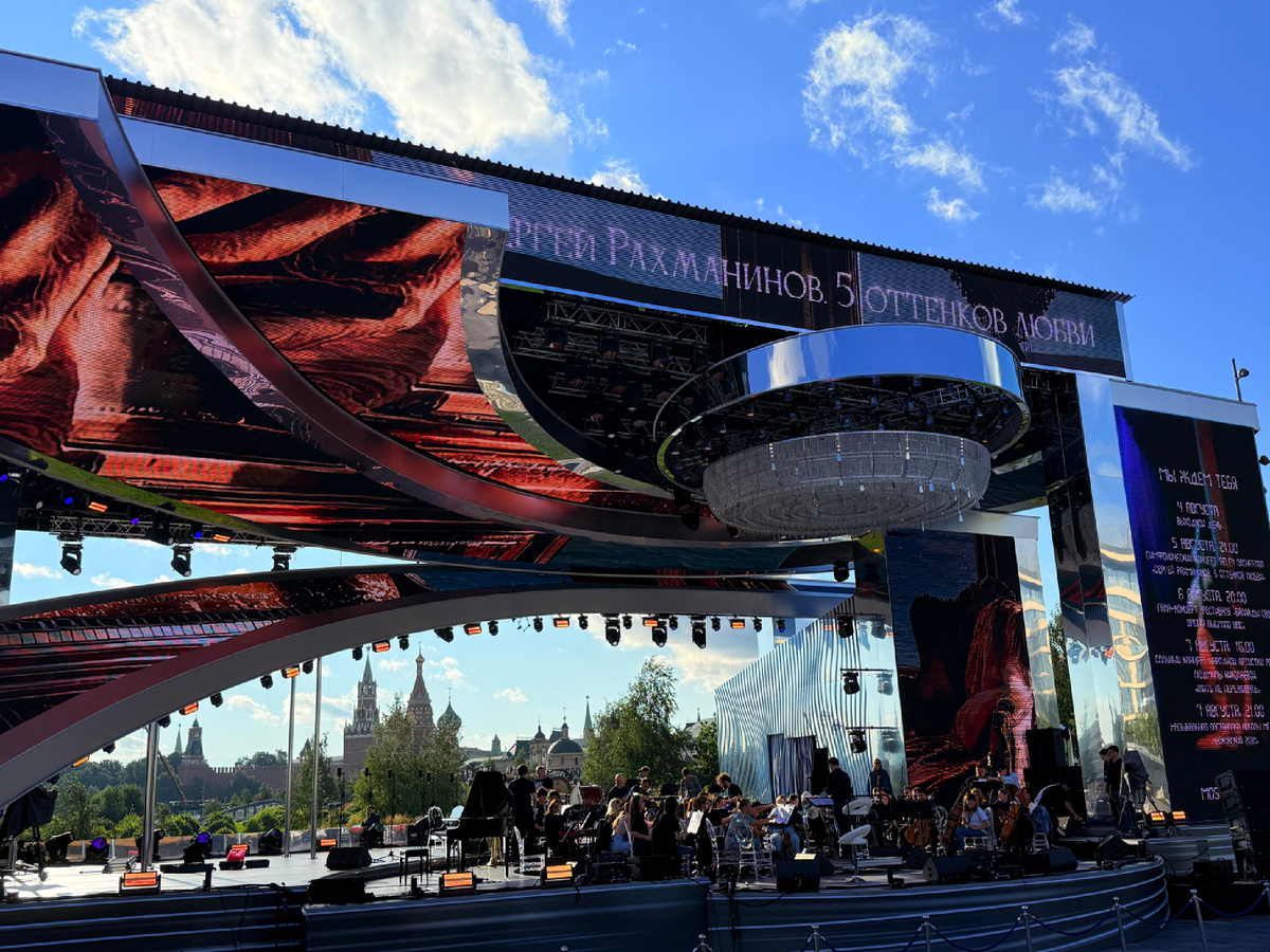 Этим летом мне очень не хватает музыки. Живой. Обычно в дороге я слушаю музыку, но в наушниках это совсем не то, что живьем. Мне не хватает живой, хорошей музыки и в Москве я стараюсь этим напитаться, хожу на разные концерты, запасаюсь впечатлениями впрок. А вчера внезапно попала на совсем необычное мероприятие - на репетицию симфонического оркестра. В парке Зарядье сейчас проходит фестиваль «Москва 2030», в рамках которого каждый день на открытой сцене проходят концерты. Мне повезло, всера давали программу «5 оттенков любви» Рахманинова. А днем проходила репетиция и настройка звука. Оказалось, это очень интересно. Музыканты настраивали инструменты и обменивались музыкальными фразами со звуковиками и друг с другом. У меня не хватало музыкальной эрудиции узнавать все произведения, из которых они играли что-то, но, судя по реакции музыкантов, это было что-то известное. Я узнала Летку-енку, сыгранную кларнетом, фрагмент из Лебединого озера от арфистки, и что-то из Моцарта от скрипачки.