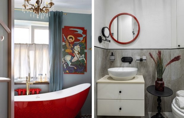 Дизайнеры Арина Олесюк и Олеся Карпова превратили бывшую кухню в необычную ванную комнату с окном, винтажной мебелью и погребом под полом. Оттенок голубой плитки напоминает глазурь, а смелая красная ванна задает ритм: ее поддерживают перекрашенные в тон трубы и радиаторы. На полу винтажная черно-белая плитка.