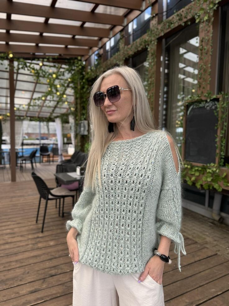 Посмотрите на эту воздушную красоту! Этот джемпер действительно выглядит потрясающе, я бы даже назвала его блузой. У него очень красивый узор по рукавам, который повторяется и в верхней части. Сам джемпер связан лицевой гладью и выполнен в свободном крое, он супер широкий!